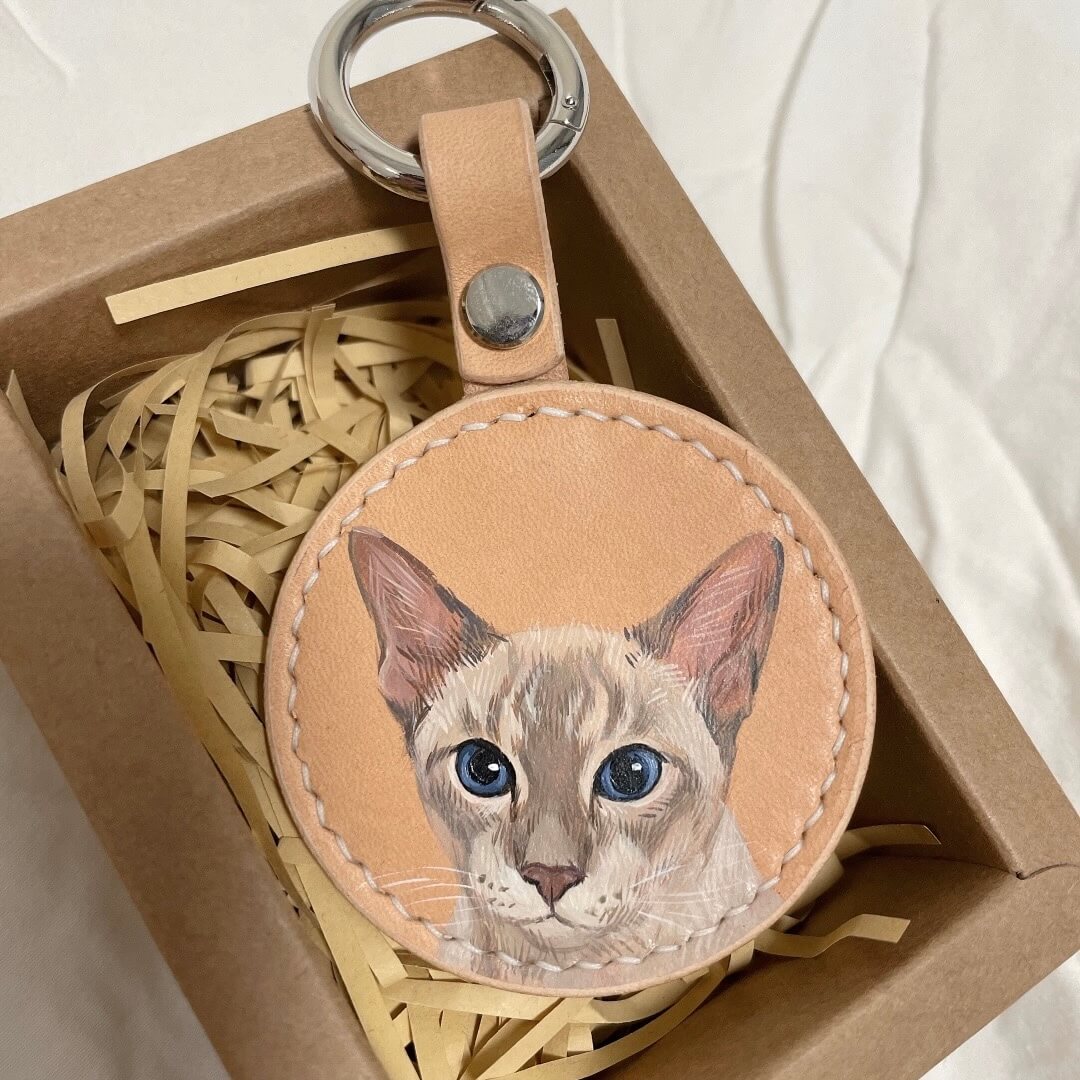 Celebrate your beloved pet with a beautifully crafted, custom leather bag tag or keychain that you'll treasure for years. Each piece is a unique keepsake, hand-painted on premium Italian leather to capture your pet’s personality in stunning detail. Paired with a silver-colored spring ring clasp, it’s both beautiful and durable—perfect for daily use. Personalize it further with an engraved message or your pet's name on the back!